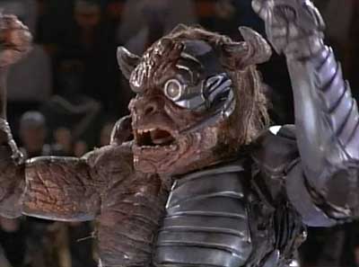 Les enjeux du film reposent donc sur des combats en arène, les relations mafieuses d’un maléfique promoteur et notre combattant humain. Celui-ci est interprété par Paul Satterfield qui vient de jouer l’un des personnages du radeau de CREEPSHOW 2. On notera que le comédien a une petite ressemblance avec Christopher Reeve mais ça ne lui donne pas pour autant des super-pouvoirs. Il fera le reste de sa carrière principalement à la télévision. En athlète combattant, il est plutôt crédible. C’est plutôt tout ce qui est autour qui donne à l’ensemble un côté un peu bancal. Et le budget limité n’arrange pas les choses. Les scènes d’entraînement, aussi, sont bien peu convaincantes.