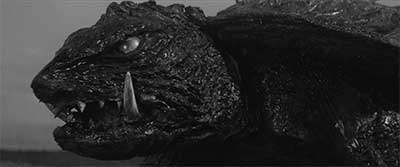 Avant GAMERA, la Daiei avait déjà proposé ponctuellement quelques œuvres «Fantastiques» au ton adulte (THE INVISIBLE MAN APPEARS, LES CONTES DE LA LUNE VAGUE APRÈS LA PLUIE…). En 1964, il est décidé de produire un film mettant en scène une horde de rats géants. Ce projet tournera court pour des raisons sanitaires car les vedettes du film, les rongeurs, sortaient de l’enceinte du tournage au grand dam du voisinage. Hors de contrôle le film est annulé avant que cela ne tourne à la catastrophe. Récemment, un film s’est intéressé à cette curieuse histoire cinématographique : NEZURA 1964 de Hiroto Yokokawa. Des cendres du film avorté en 1964 va naître GAMERA. Des décors miniatures de villes sont déjà fabriqués ou en cours de fabrication. La mise en chantier d’un film de monstre géant est donc aussi l’opportunité de faire une économie sur une partie des décors. Une dizaine d’années après le premier GODZILLA, on propose une structure narrative assez proche de l’original. Une créature venue de la nuit des temps sort de son sommeil à cause d’une explosion nucléaire. La bestiole provoque des destructions pendant que des militaires et des scientifiques cherchent à résoudre ce très gros problème. Les scientifiques finissent par proposer un plan élaboré pour mettre un terme à la menace. Ce sont les grandes lignes du GODZILLA de 1954 mais aussi celles du GAMERA de 1965. Entre ces lignes, on remarque tout de même des différences notables. Dès le départ, GAMERA est présenté comme une créature mythologique liée à la légende de l’Atlantide. La tortue géante est réveillée par une explosion mais elle ne fait pas l’objet d’une mutation liée au nucléaire. Durant l’antiquité, et même avant, elle dispose déjà de ses pouvoirs. L’ombre de la menace radioactive est évoquée mais cela n’est absolument pas central. Là où GODZILLA exprimait la peur du nucléaire sur un ton assez sombre, GAMERA s’en écarte et adopte une ambiance beaucoup moins lourde. Alors, bien sûr, cela n’empêche pas la tortue de détruire des bâtiments et autres infrastructures menant inévitablement à des pertes humaines. Dans le film, on nous montre même une séquence où le monstre élimine un parterre d’humains soustraits à la vie (l’image passe soudain en négatif) !