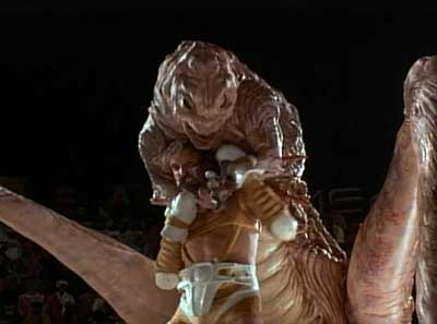 Pas de tournage en extérieur, ARENA se cantonne en majeure partie à une station spatiale habitée par une multitude de personnages. C’est aussi une sorte de carrefour dans l’espace. Cette idée, on la retrouve dans les séries télévisées STAR TREK : DEEP SPACE NINE et BABYLON 5 qui n’arriveront qu’une poignée d’années plus tard. Il est peu probable que ARENA ait été une source d’inspiration bien que l’on y trouve des comédiens qui œuvreront plus tard sur ces deux séries : Marc Alaimo, Armin Shimerman et Claudia Christian. Plus étonnant encore, le personnage interprété par Armin Shimerman tient un bar dans la station alors qu’il sera aussi tenancier d’un débit de boisson dans STAR TREK : DEEP SPACE NINE. Des histoires de stations spatiales peuplées d’extraterrestres hétéroclites, il en existe beaucoup dans la littérature de science-fiction et, bien évidemment, dans la série STAR TREK originale. On y trouve déjà un épisode intitulé «Les enchères de Triskelion» où quelques membres de l’équipage sont capturés et forcés à se battre. Et, bien après ARENA, on retrouvera une arène de combats inter-espèces extraterrestre dans l’épisode «Tsunkatse» de STAR TREK : VOYAGER mettant en scène, entre autres, The Rock (Dwayne Johnson) ! Toutefois, le sujet n’est finalement pas si exploité que cela et cela pourrait donner à ARENA un aspect surprenant et intéressant…
